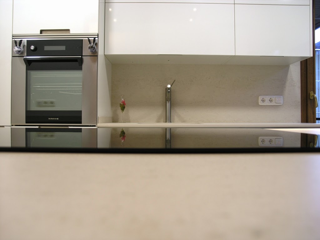Es un proyecto de Arakama 2000, con el modelo Minos-L de Santos, en laminado blanco brillo con tirador oculto e integrado en el frente, encimera Dekton Danae y electrodomésticos De Dietrich, Gutmann y Siemens.