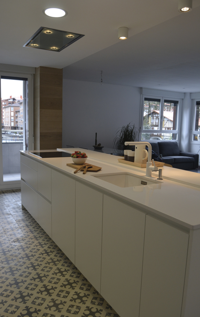 El diseño está basado en una isla como elemento principal y zona de trabajo, con placa de inducción, fregadero bajo encimera a juego con la superficie de cuarzo Blanco Zeus de Silestone, lavavajillas integrado, cajones y caceroleros, además de una barra para desayunos indispensable en estos casos.
