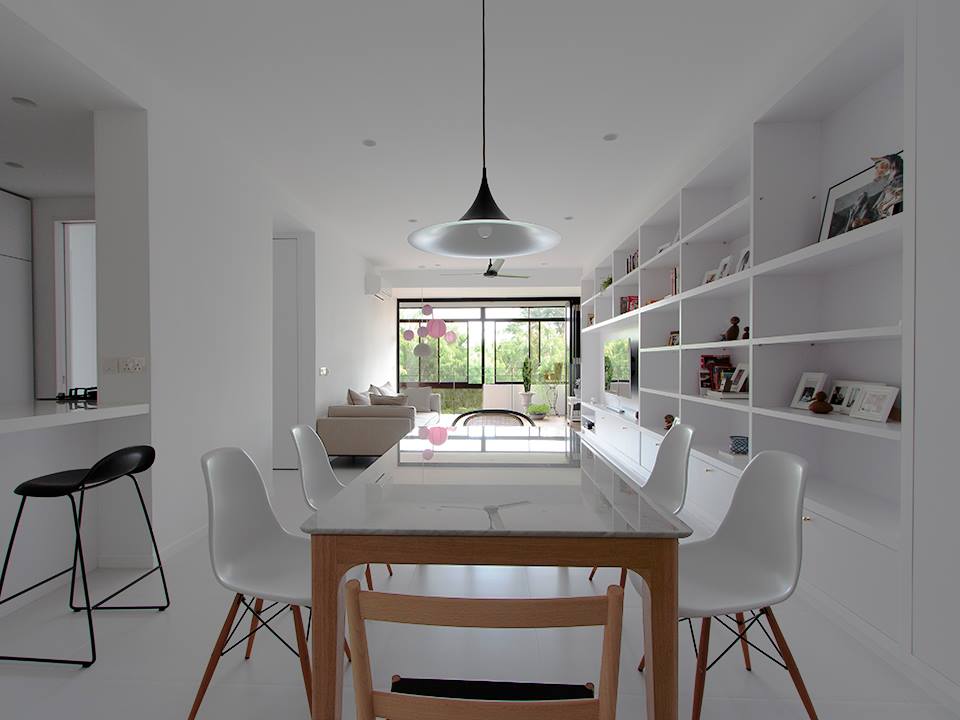 La luminaria embutida en el techo y la lámpara colgante sobre la barra completan un estupendo diseño moderno y funcional. Es un proyecto de Atelier M+A con sede en Singapur.