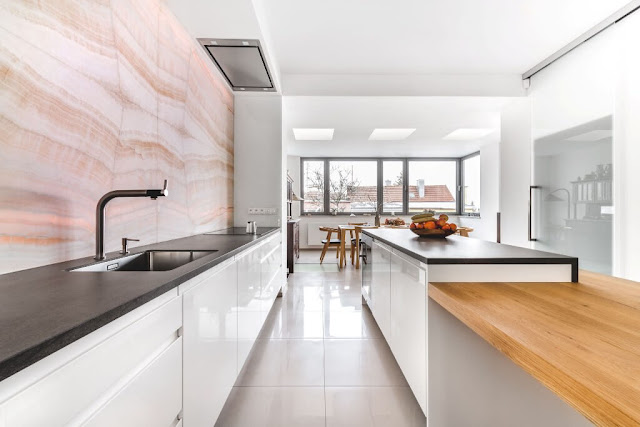 Uno de los detalles que dominan la escena, es esa pared de ónix que parece establecer las reglas del orden y el estilo de vida que debe predominar en la estancia.